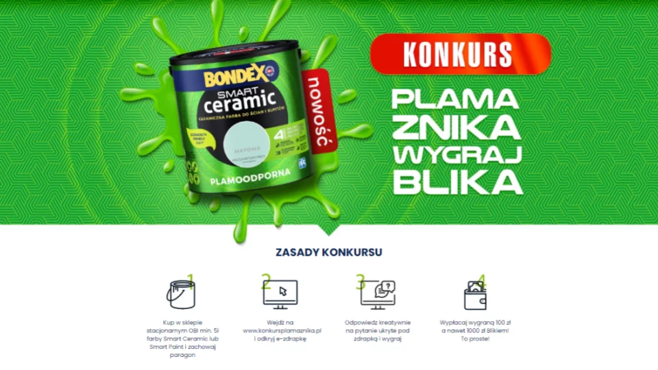 - Zrób zakup co najmniej 5 litrów promocyjnej farby Bondex Smart Ceramic (na jednym paragonie) w sklepach OBI między 23.06.2021 r. a 11.07.2021 r.