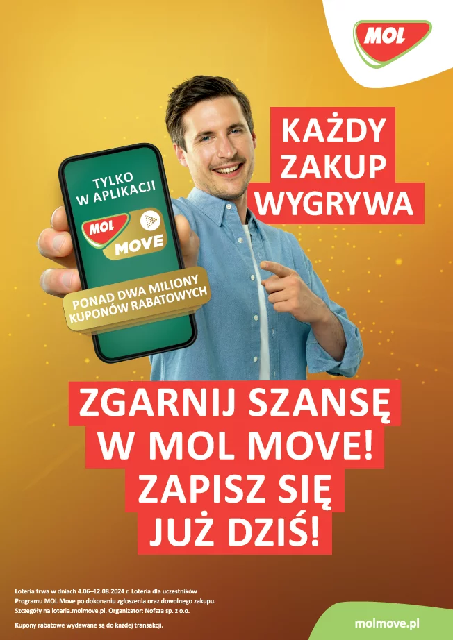 Mechanizm loterii Zaloguj się na swoje konto lojalnościowe programu MOL Move i wyraź zgodę na udział w loterii. Między 04.03.2026 r. a 31.05.2026 r. dokonaj jednorazowego zakupu, przy użyciu karty MOL Move, nie mniej niż 1 litra dowolnego paliwa/paliw dostępnych na stacji MOL/LOTOS lub towarów i...