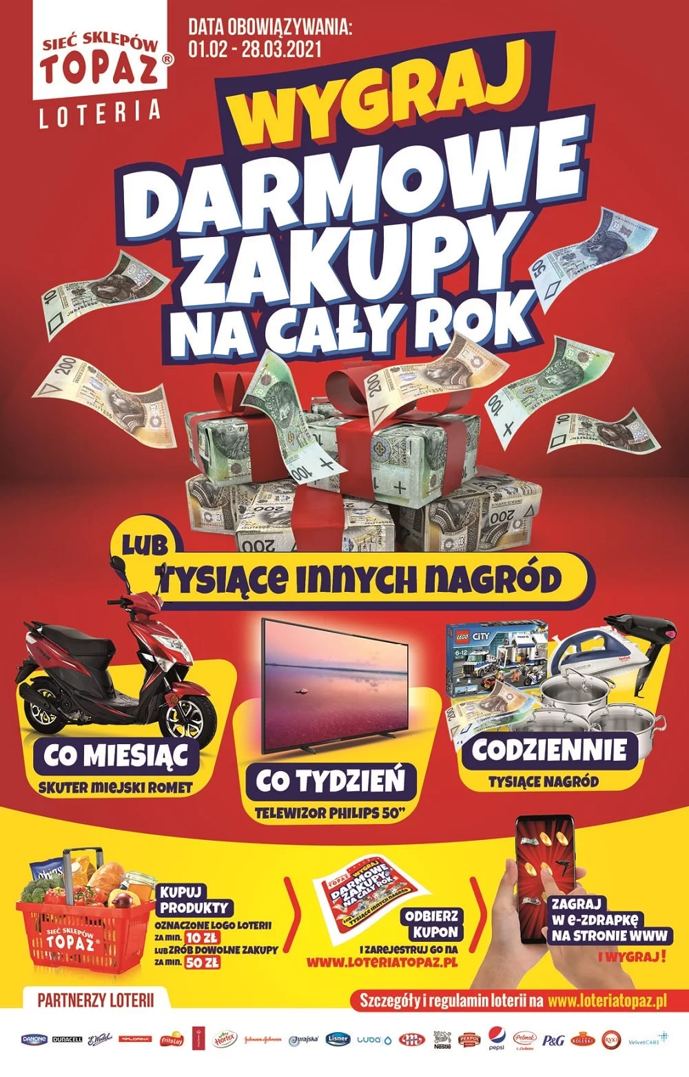 - 5400x nagród codziennych w postaci: talonów o wartości: 10 zł, 50 zł, 100 zł; żelazko, suszarka, zestaw garnków Tefal, zestaw klocków Lego oraz 1000 punktów lojalnościowych na kartę klienta Topaz