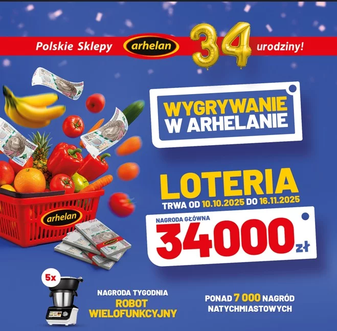 - zrób zakupy w jednym ze sklepów Arhelan między 10.10.2025 r. a 16.11.2025 r. za minimum 70 zł*, w tym kup przynajmniej jeden produkt loteryjny,